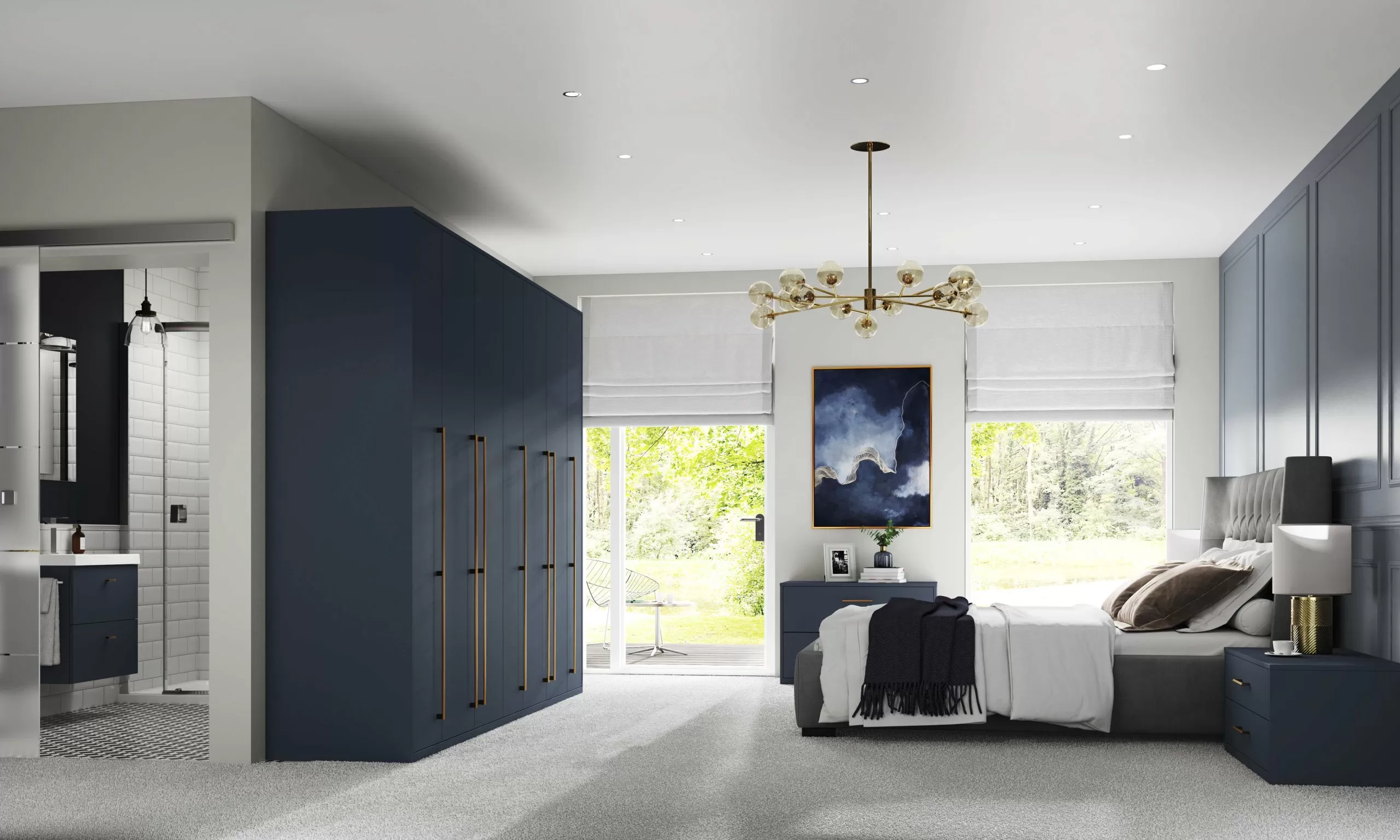 Inspired by city living, Nebula combines artistic flair with luxury tone of Matt Indigo and the subtle tone of Matt Pebble. Use sleek Brass or Titanium accessories for an inspiring approach to your bedroom decor.