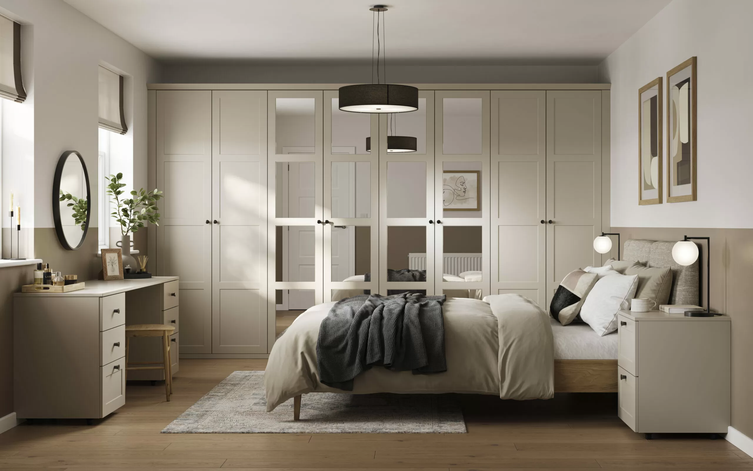 Nexus showcases its classic shaker design with paneled wardrobe doors including a mirrored door option. Complement this sophisticated design with on trend dark brass handles to create a stunning bedroom.