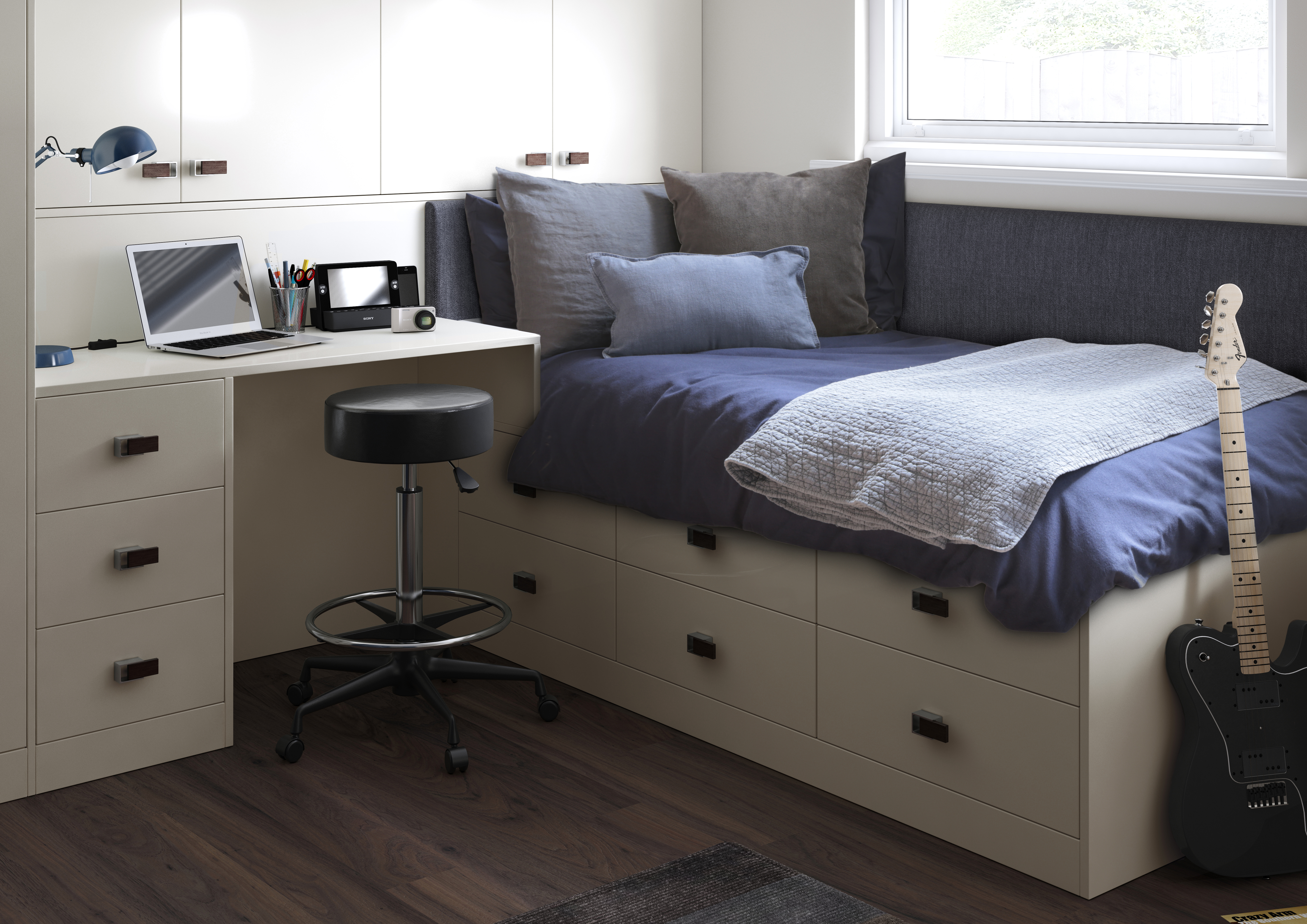 Available in seven high sheen finishes, the doors and drawers are completed with stylish tab handles.