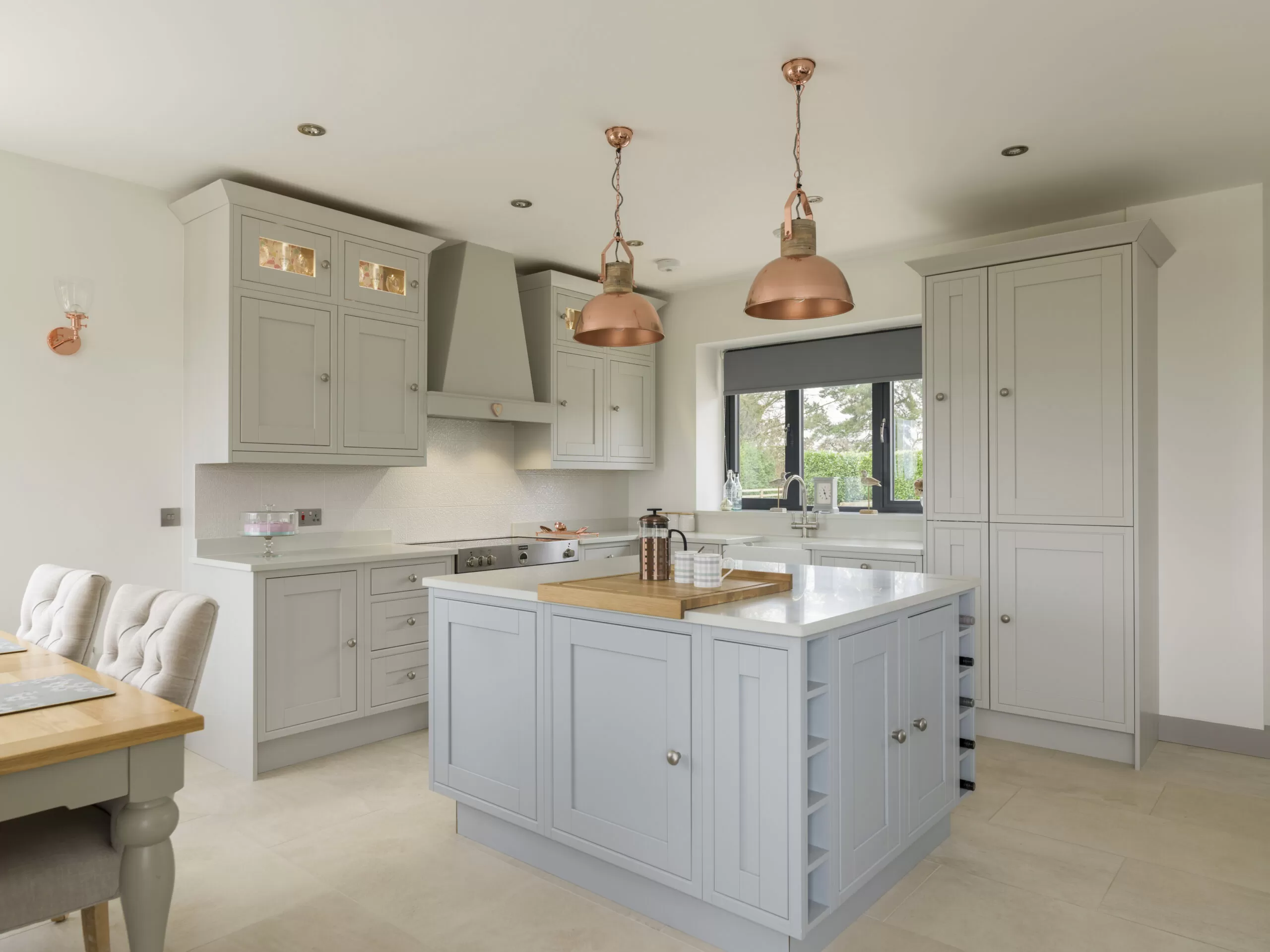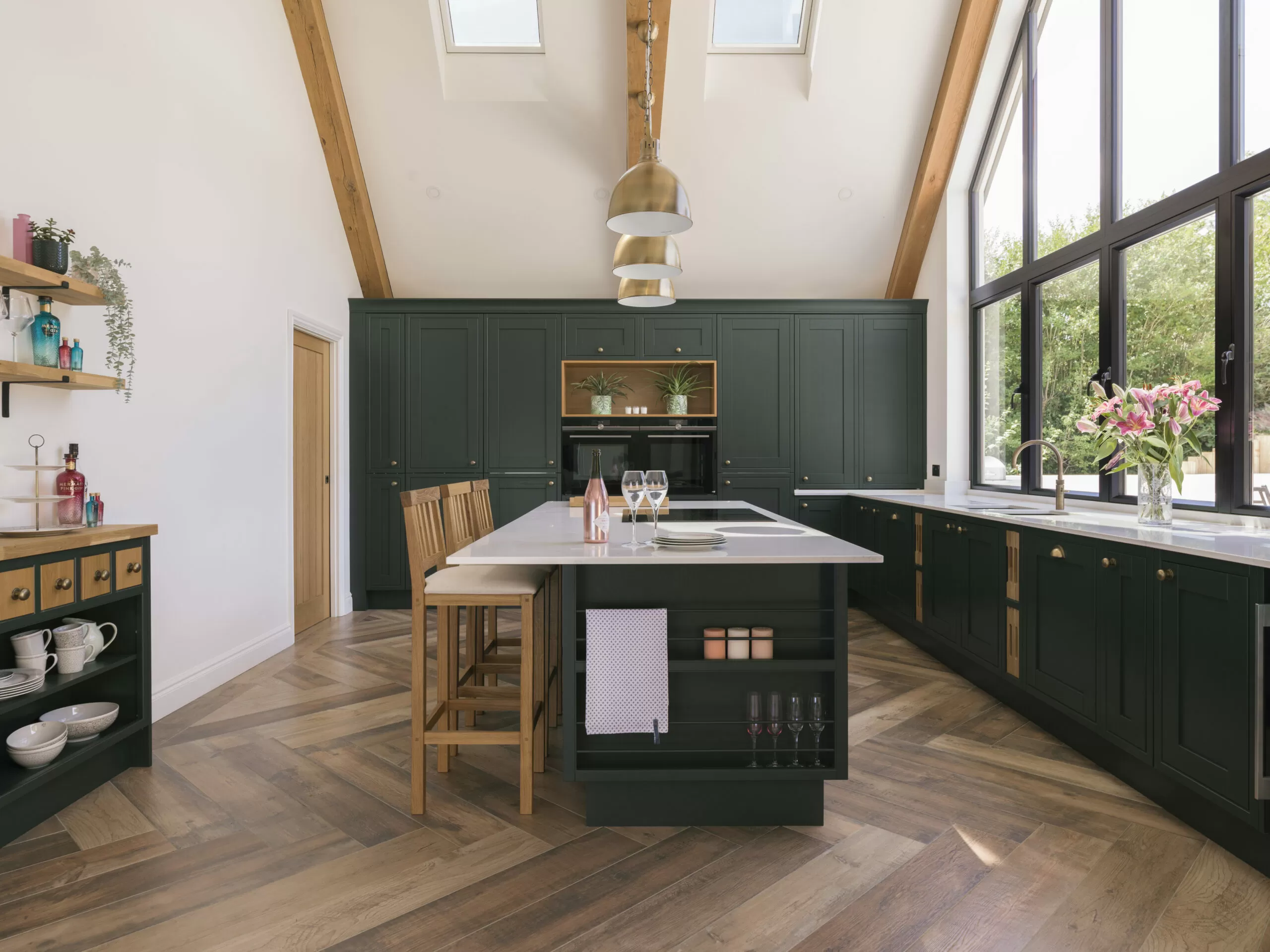 This elegant Laura Ashley Harwood country kitchen is a finely crafted in-frame timber design, available in 22 matt painted colours, including striking Hunter Green. Choose from specially selected features, such as glazed cabinets, spice drawers and bi- fold dressers to make your design unique.