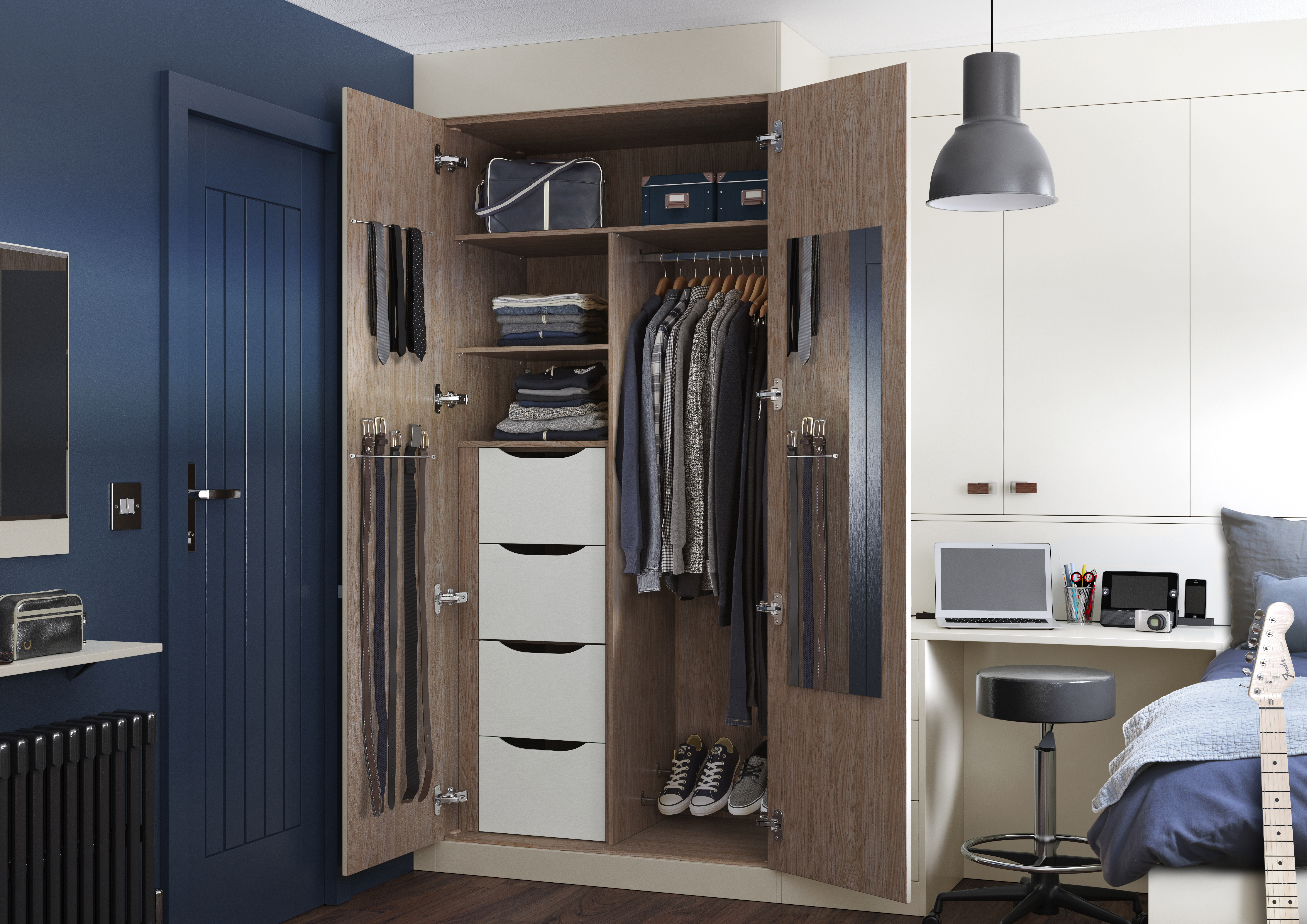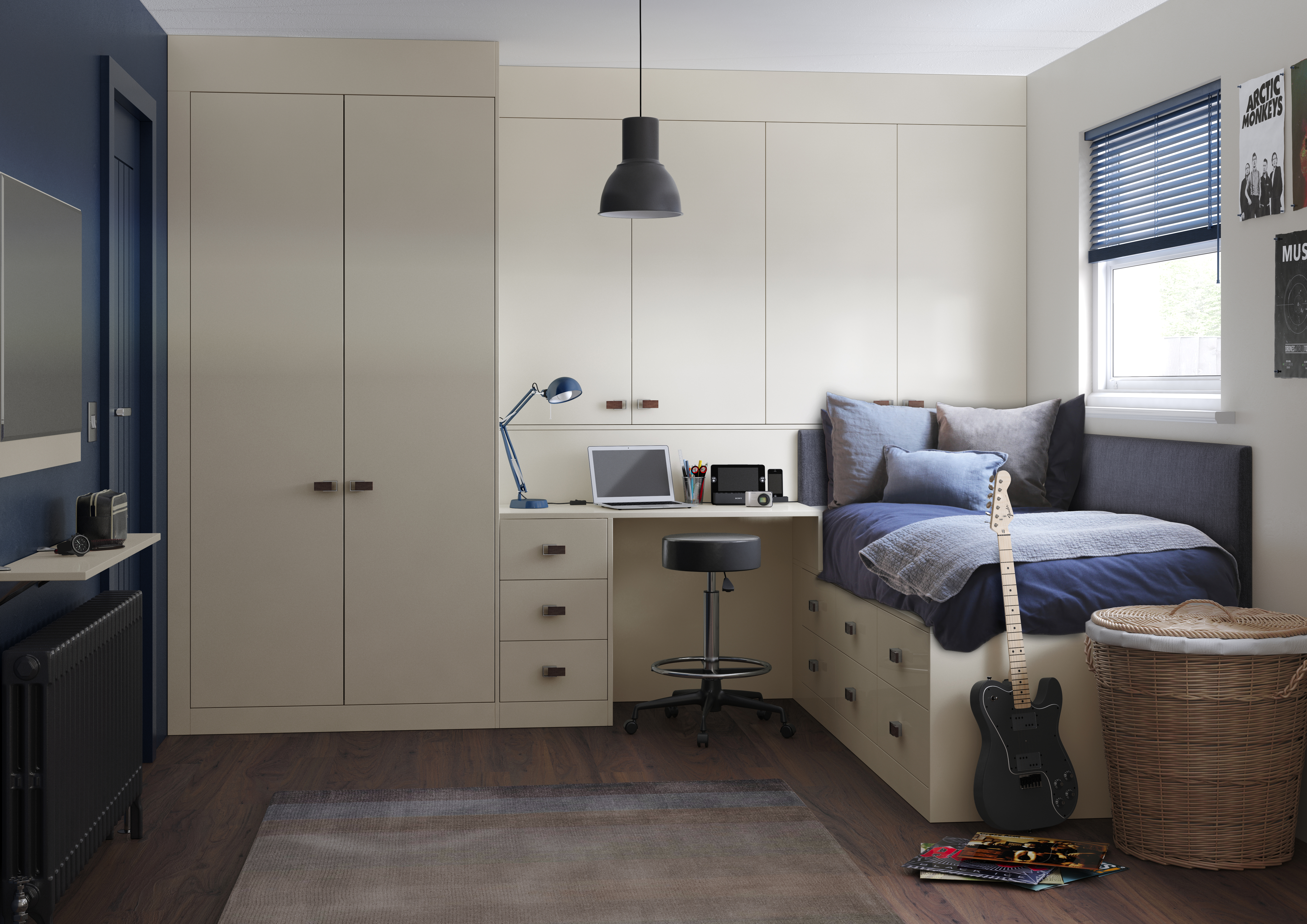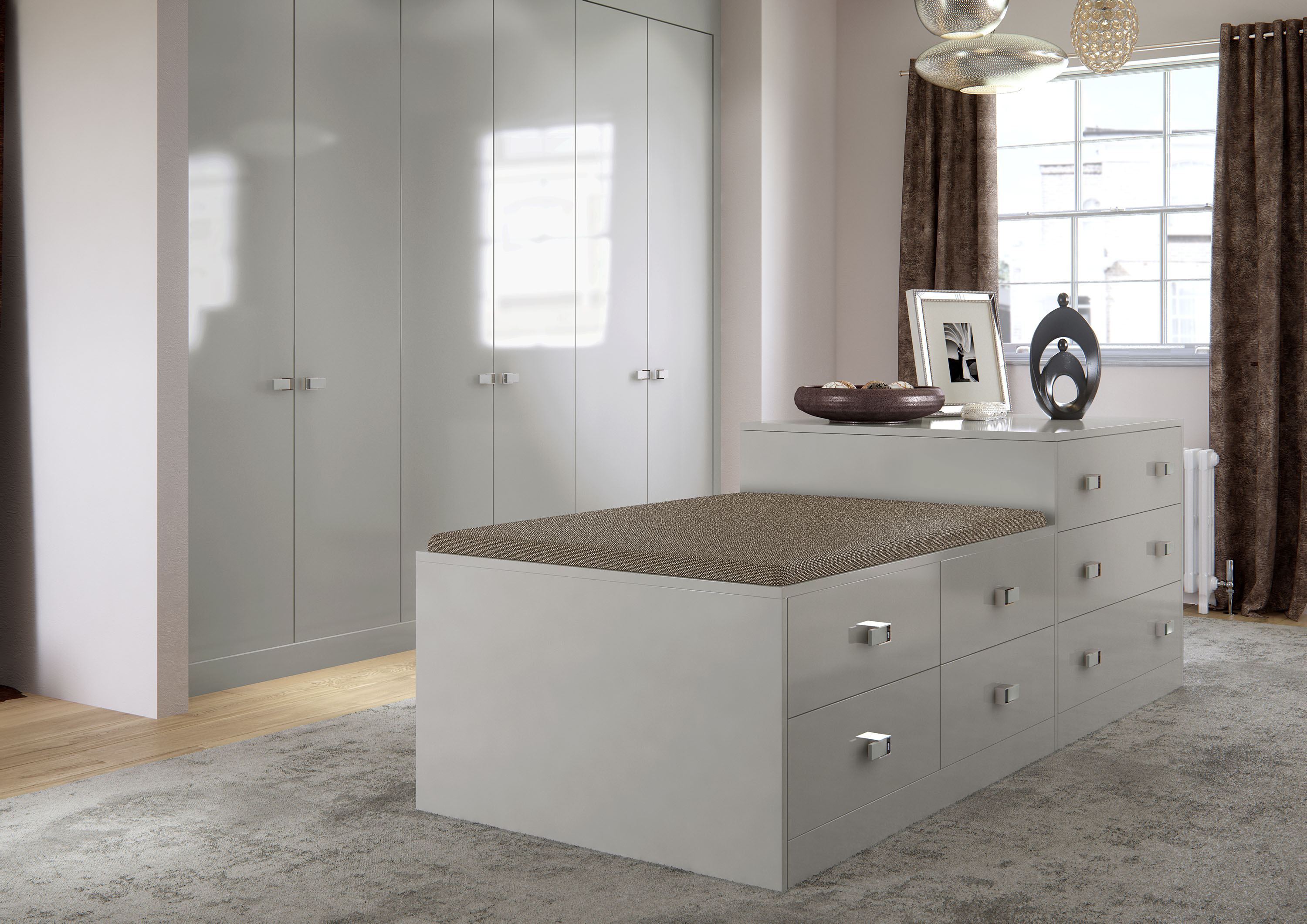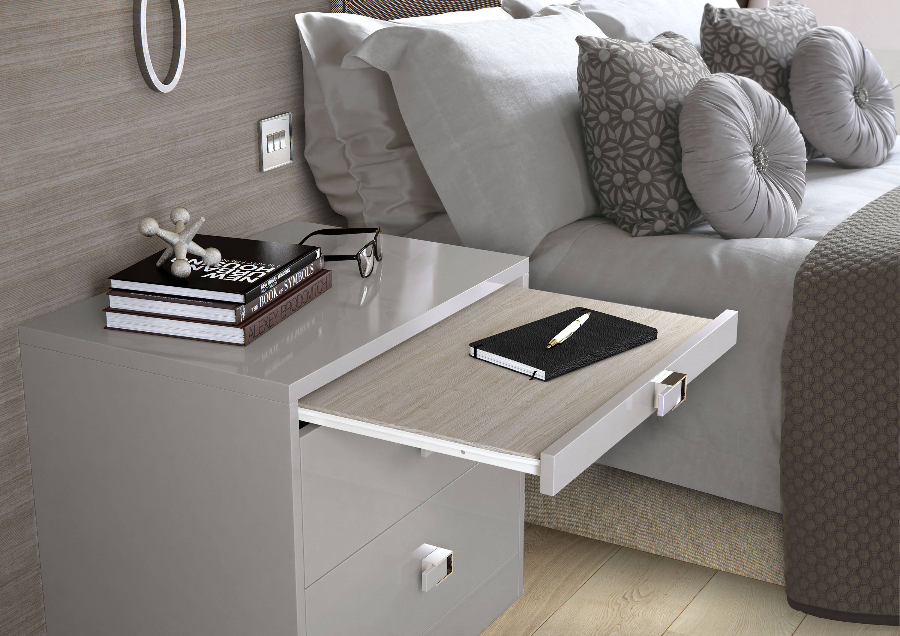 Available in seven high sheen finishes, the doors and drawers are completed with stylish tab handles.