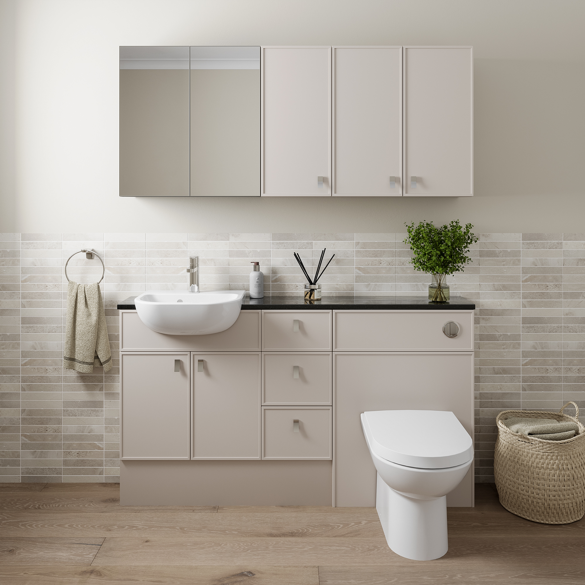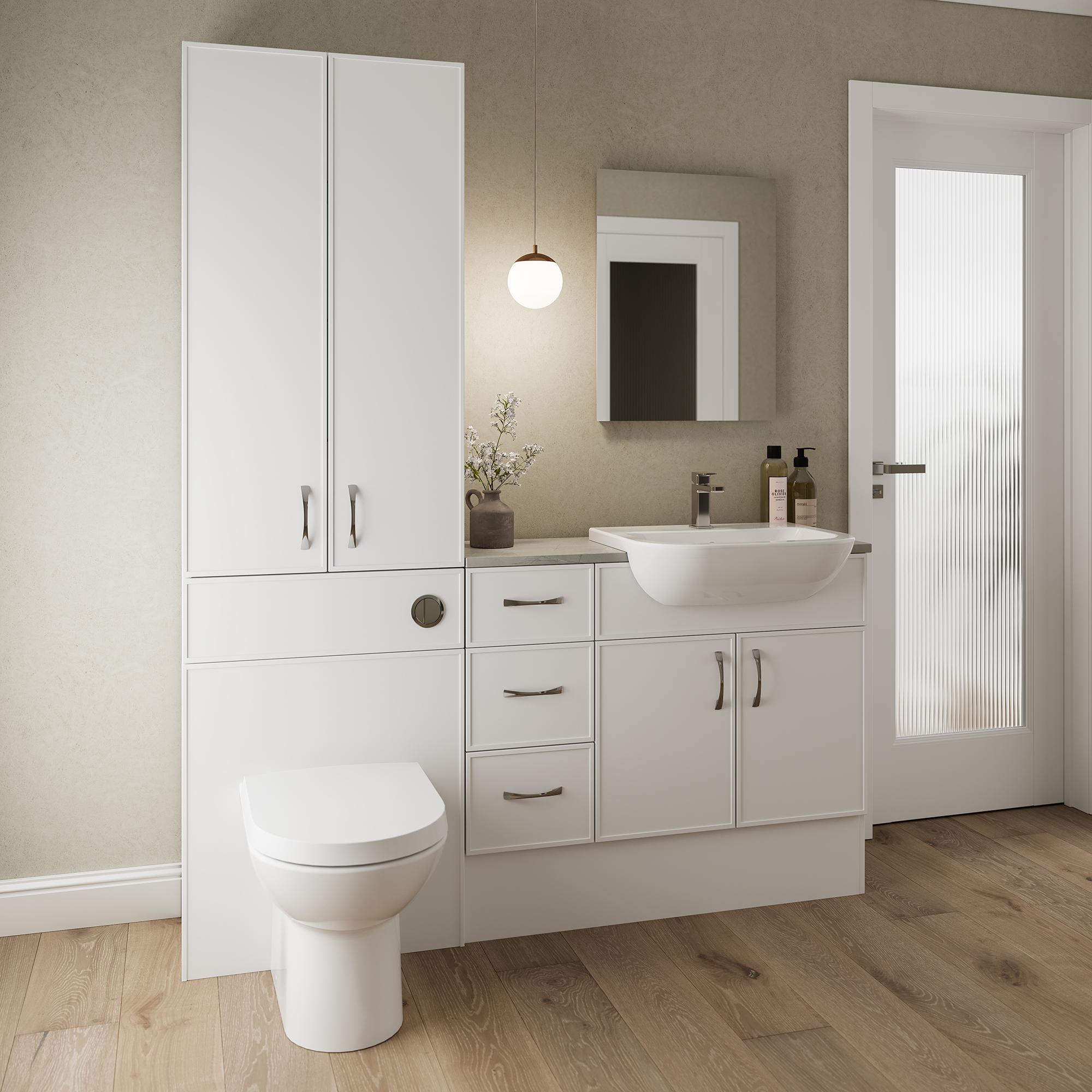 Introducing Vasso, featuring a modern tea tray style shaker door, this range combines timeless design with a sleek, matt finish in six versatile colours. The Vasso range offers a perfect blend of contemporary aesthetics and practical storage solutions. The clean lines and classic shaker design give a sophisticated touch to any bathroom, while the tea tray style provides a refined, minimalist look. With six stunning matt finishes to choose from, Vasso is designed to complement a wide variety of bathroom styles. Whether you’re creating a tranquil retreat or adding a pop of colour to your space, this range delivers both durability and style, offering an elegant solution for organizing your bathroom essentials.
