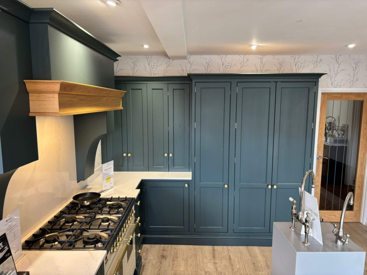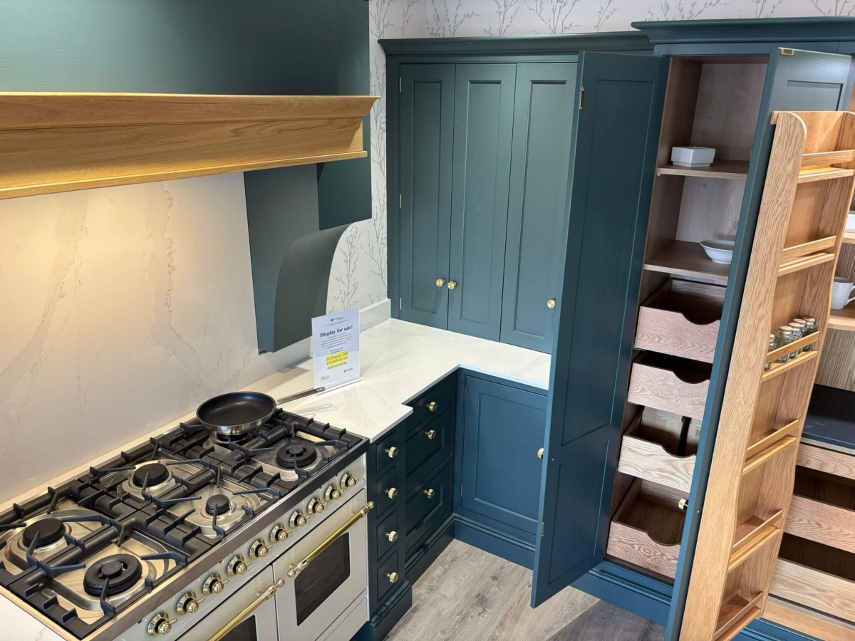 Ex display Caledonia Kitchen by Ashley Ann. Installed in 2024. Painted ash with oak carcases and solid oak dovetail drawer boxes.