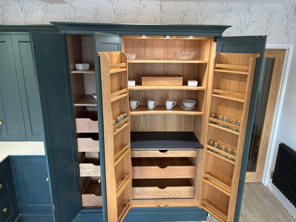 Pantry units have veneered inserts and drawers with slate slab and spice racks. This is an exquisite kitchen with surface mounted skirting plinths.