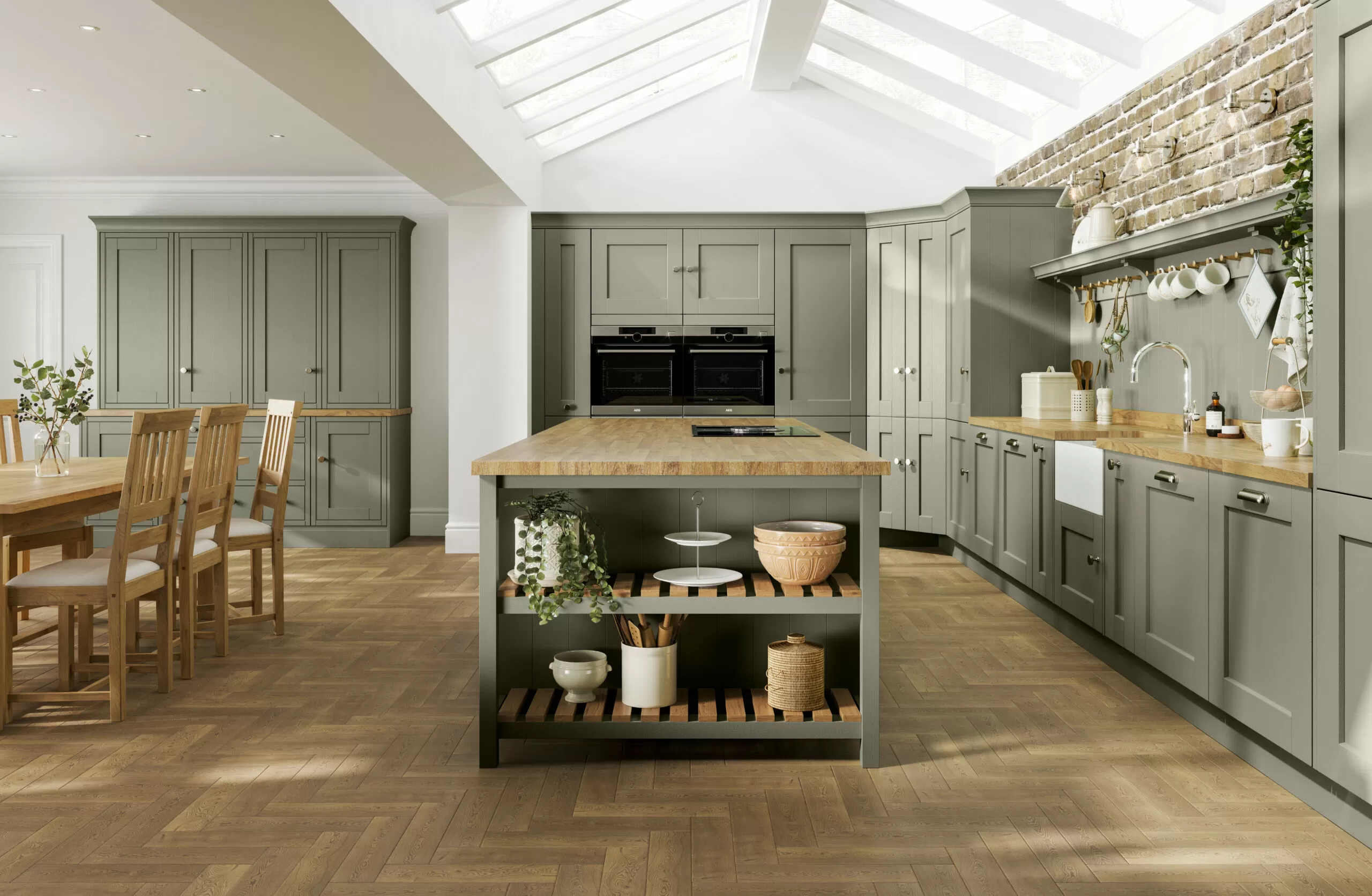 Clean lines and classic styling give a sense of calm to our Laura Ashley Whitby kitchen, which looks at home in urban or country, modern or period properties. Oak worktops complement painted cabinets, shown here in Fern Green. The finishing touch: polished nickel cup and knob handles.