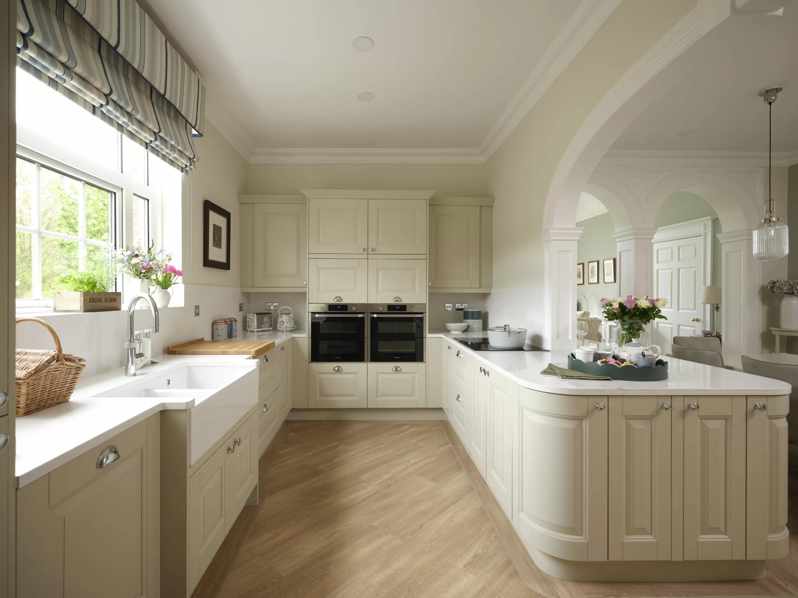 The Laura Ashley Bedale’s painted doors are inspired by the kitchens and pantries of period townhouses. Combined with modern colour tones and delicate handles, the design is elegant and timeless. Bedale’s unique features include glazed bridging cabinets which complement perfectly with the glazed wall cabinets. Cabinet interiors are also available in a choice of contrasting decors for a luxury finish.